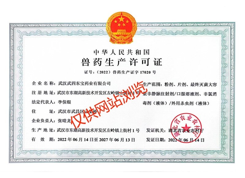 武漢武四東寶藥業(yè)有限公司,是在原武昌獸藥廠(成立于1972年)基礎(chǔ)上發(fā)展而來,公司位于武漢市東湖新技術(shù)開發(fā)區(qū)左嶺工業(yè)園,是一家專業(yè)從事動物保健品的研發(fā)、生產(chǎn)、銷售和服務(wù)于一體的高新技術(shù)企業(yè),目前擁有六條生產(chǎn)線、十種劑型(最終滅菌小容量注射劑、最終滅菌大容量非靜脈注射劑、口服溶液劑、粉劑、預(yù)混劑、固體殺蟲劑、液體殺蟲劑、片劑、顆粒劑、液體消毒劑)。公司成立于2004年,2006年全面通過國家農(nóng)業(yè)部獸藥GMP認(rèn)證,已成為中國獸用保健行業(yè)知名企業(yè)之一。武漢武四東寶藥業(yè)有限公司自創(chuàng)建以來,一直秉承著“善、行、學(xué)、成”的核心價(jià)值觀,恪守“一切為了健康養(yǎng)殖”的企業(yè)使命,堅(jiān)持“科技成就價(jià)值,服務(wù)創(chuàng)造未來”的服務(wù)理念,經(jīng)過多年不斷的創(chuàng)新與發(fā)展,逐步形成了自己的核心競爭力,并在行業(yè)中脫穎而出。公司與中國農(nóng)業(yè)大學(xué)、華中農(nóng)業(yè)大學(xué)、武漢工程大學(xué)、武漢工業(yè)學(xué)院、中科院水生所等全國知名院校和科研院所建立了長期密切的合作關(guān)系,通過聯(lián)合攻關(guān)和技術(shù)引進(jìn)等方式,研發(fā)出50多種優(yōu)質(zhì)、高效、穩(wěn)定的產(chǎn)品,并深得廣大用戶的認(rèn)可與信賴。公司以“追求健康的用戶群體和卓越市場占有率”為經(jīng)營理念,堅(jiān)持以市場為導(dǎo)向,強(qiáng)化科技創(chuàng)新,拓展產(chǎn)品結(jié)構(gòu),努力為我國健康養(yǎng)殖事業(yè)的發(fā)展作出更大的貢獻(xiàn)!